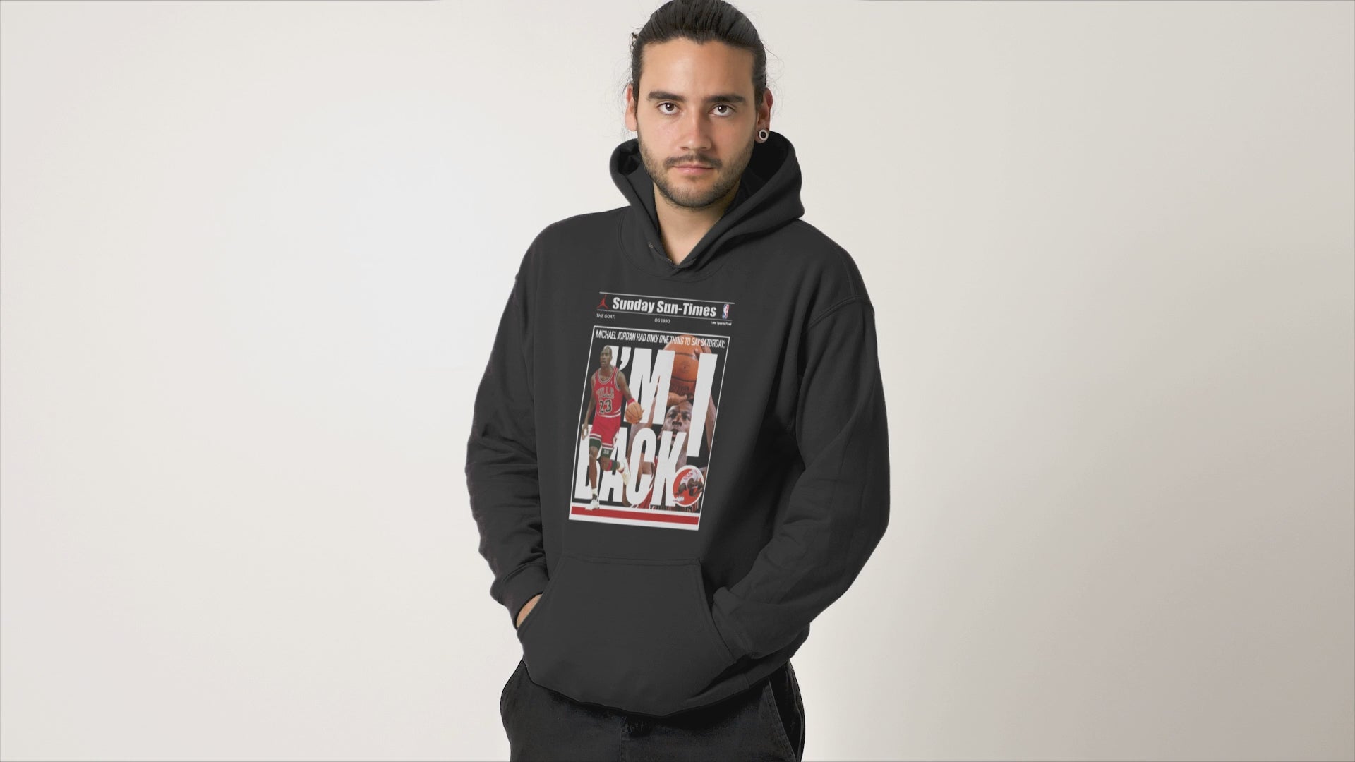 This Retro Newspaper Hoodie matches with your Air 5's Fire Red Black Tongue Sneakers. Graphic features Jordan wearing the retro fire red 5's; is generated using a DTF printer and applied with a commercial heat press. All sweatshirts are 100% cotton for supreme comfort and durability! Hoodies and sweatshirts are available in the colors: White, Black and Red.